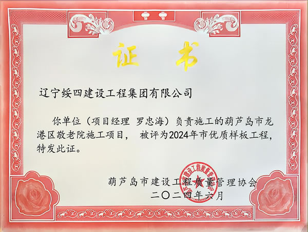 葫蘆島市龍港區(qū)敬老院施工項目被評為2024年市優(yōu)質(zhì)樣板工程