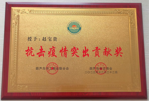 2023年12月22日,葫蘆島市工商業(yè)聯(lián)合會(huì)、葫蘆島市總商會(huì)共同授予綏四建工集團(tuán)董事長(zhǎng)趙寶貴“抗擊疫情突出貢獻(xiàn)獎(jiǎng)”。