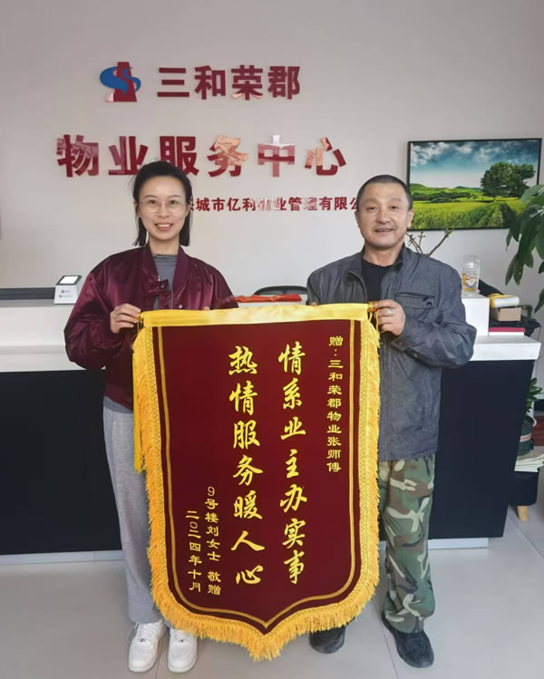 10月25日,業(yè)主劉女士將一面繡有“情系業(yè)主辦實事 熱情服務(wù)暖人心”字樣的錦旗送到了三和榮郡物業(yè)服務(wù)中心,對維修師傅張興軍及時解決水管漏水問題表示感謝。