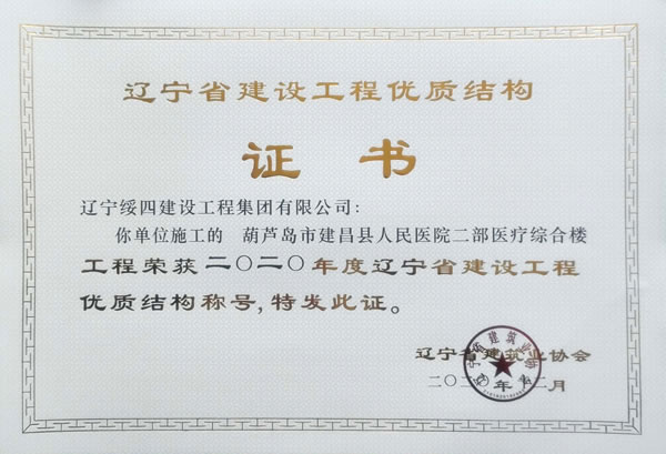 “葫蘆島市建昌縣人民醫(yī)院二部醫(yī)療綜合樓”榮獲2020年度遼寧省建設工程優(yōu)質(zhì)結(jié)構(gòu)稱號