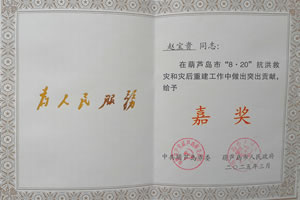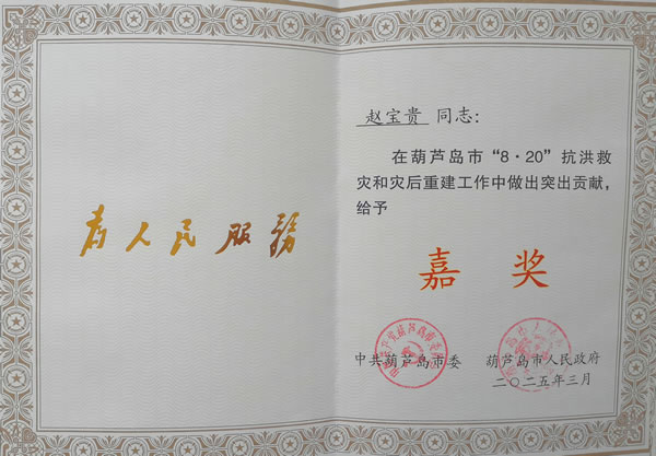 嘉獎:趙寶貴同志在葫蘆島市“8·20”抗洪救災(zāi)和災(zāi)后重建工作中做出突出貢獻(xiàn)